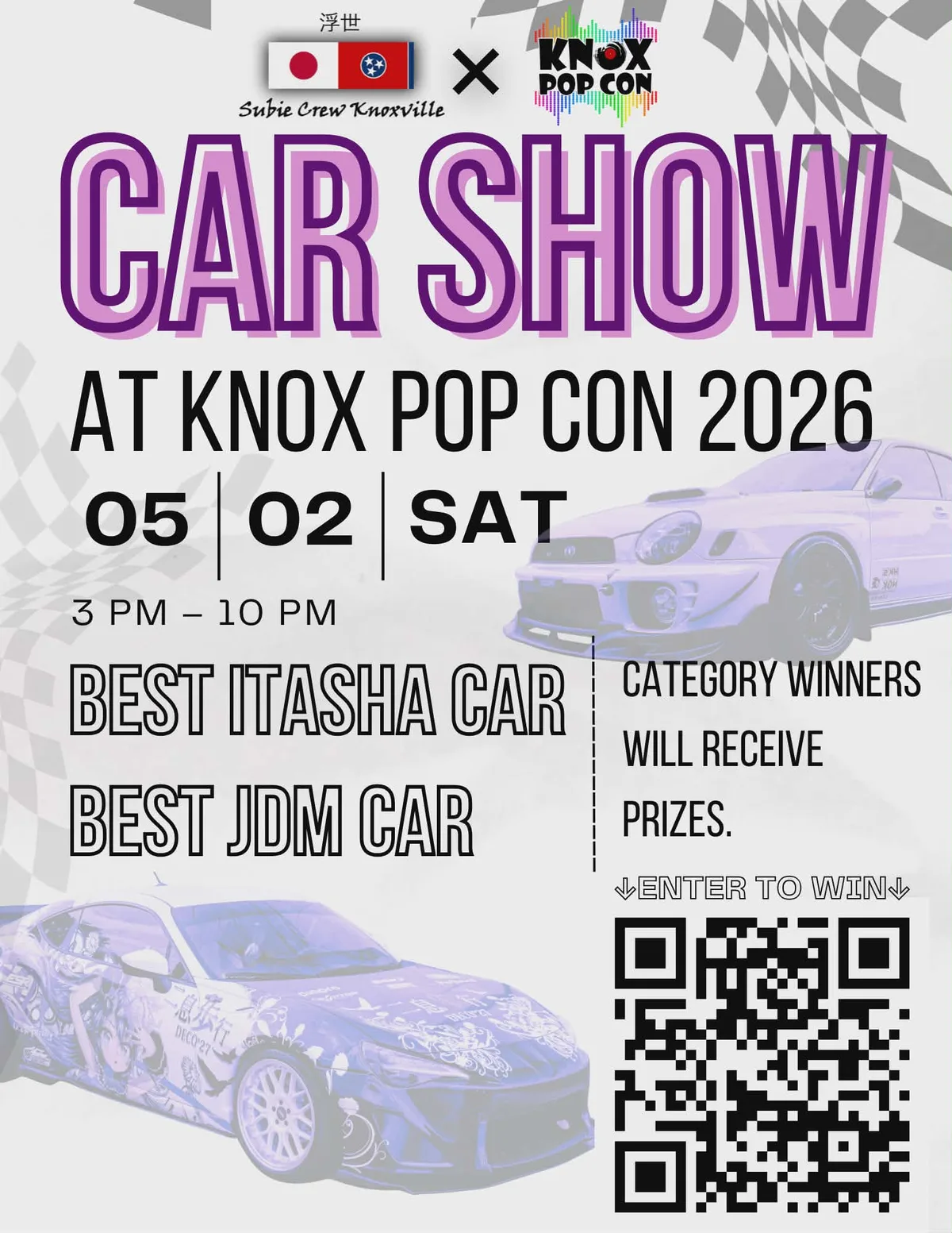 Knoxville's Subaru and JDM enthusiast community hosts the official car show at Knox Pop Con 2026 โ where Japanese automotive culture meets the world of anime, K-Pop, and pop culture.